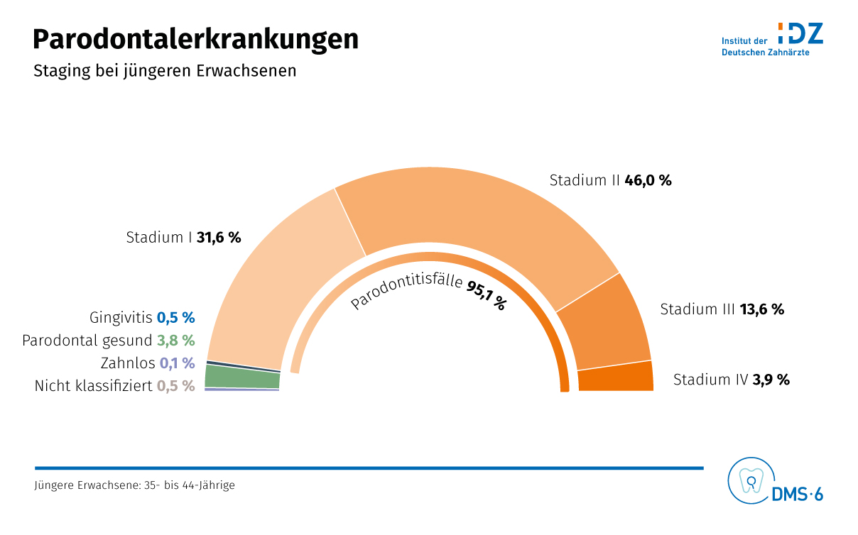 Die Prävalenz von Parodontitis ist bei jüngeren Erwachsenen und jüngeren Seniorinnen und Senioren in Deutschland hoch und liegt bei schweren Formen der Parodontitis (Stadium III und IV) bei 17,5 %/52,7 %.