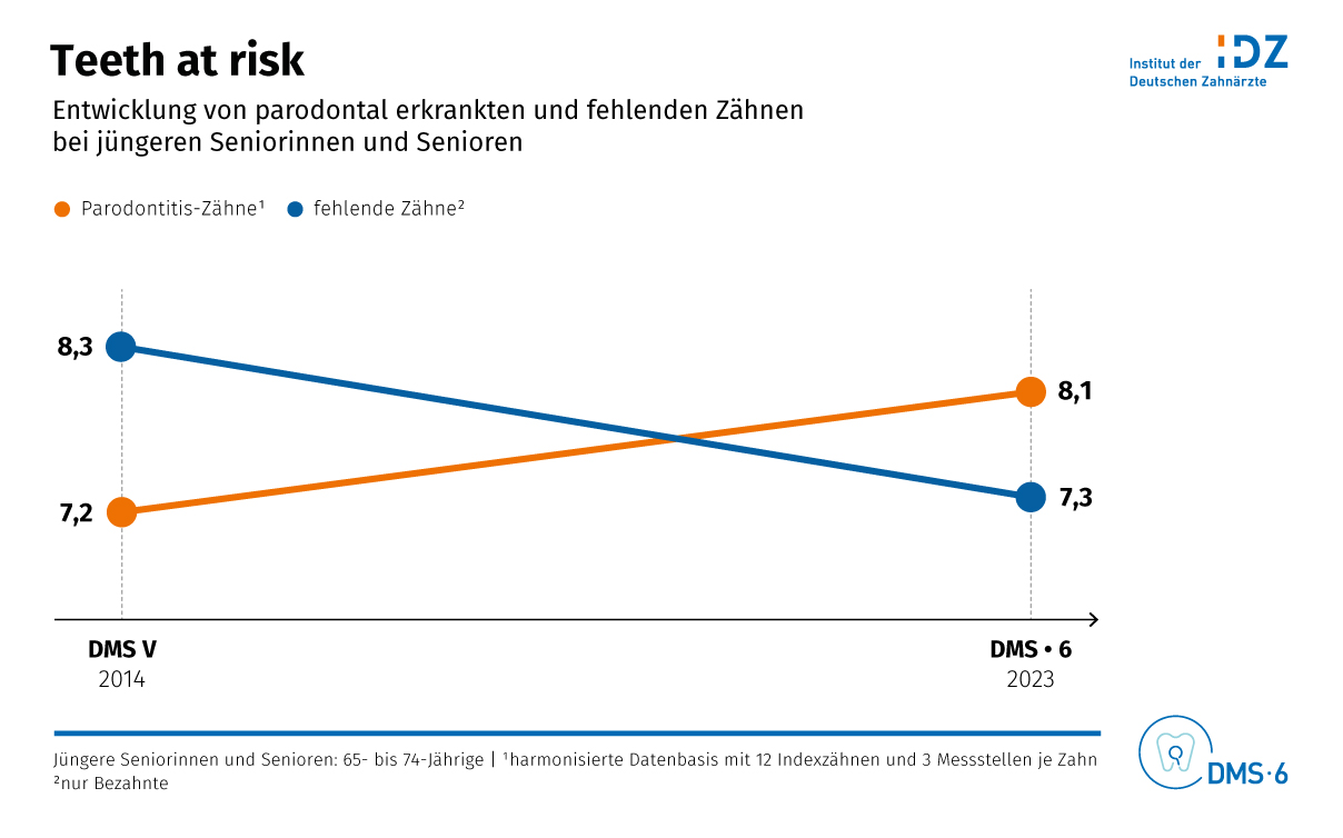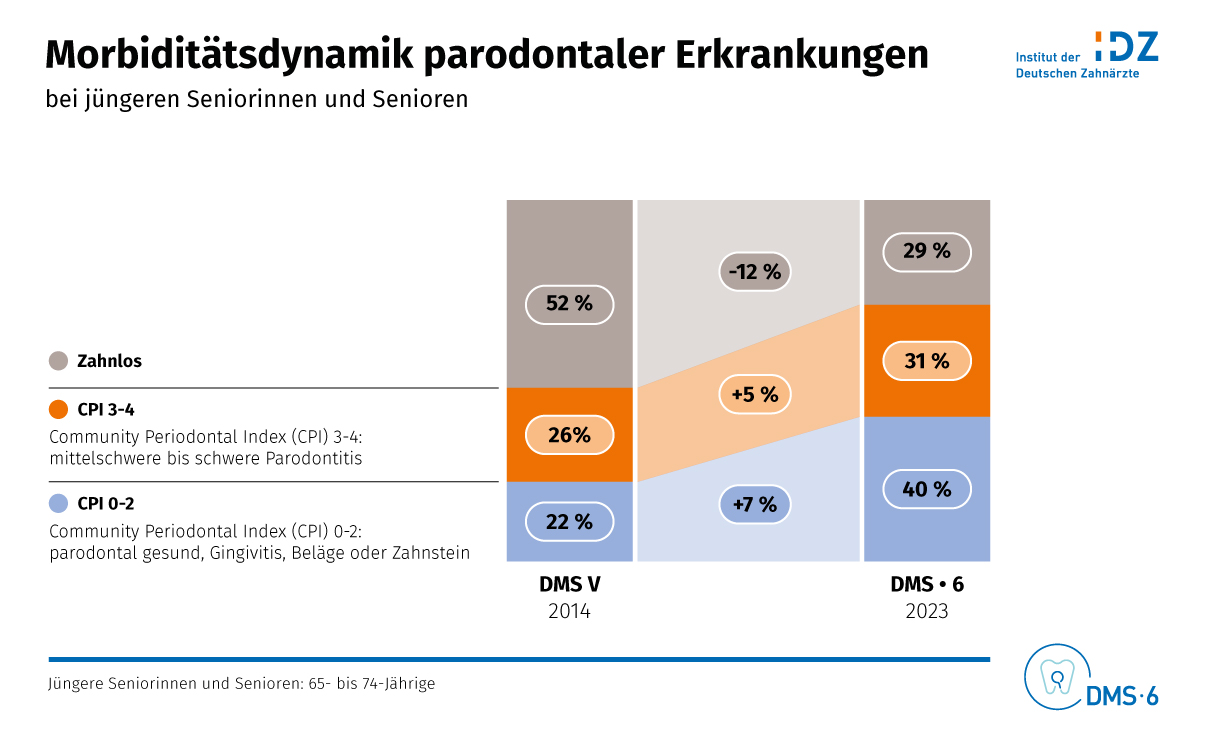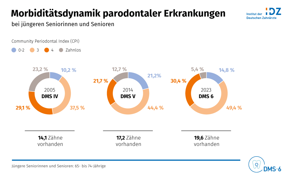 Der Anteil zahnloser Senioren sank zwischen DMS IV und DMS 6 deutlich von 23,2 % auf 5,4 %. Ebenso war die durchschnittliche Zahnanzahl bei Senioren mit Restzahngebiss in DMS 6 um 2,4 Zähne höher. Während die durchschnittliche PD bei Erwachsenen bei 2,4 mm und bei Senioren bei 2,8 mm blieb, wurden uneinheitliche Muster bei den Ausmaßvariablen festgestellt.